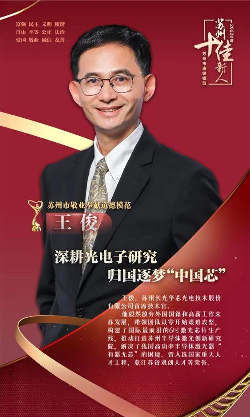 王俊,苏州长光华芯光电技术股份有限公司副董事长、常务副总经理、首席技术官。他带领团队从零开始,推动建设苏州半导体激光创新研究院,有力推动我国超高功率激光技术及其应用的快速发展。他曾入选国家重大人才工程,获江苏省双创人才、苏州杰出人才奖等荣誉。