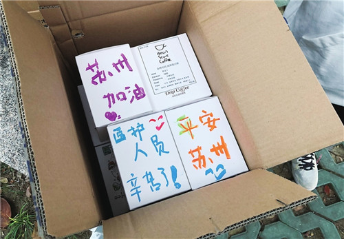 市立医院东区护理部主任杨雪芳介绍,当时工作人员正忙着给排队的市民采样,突然有个年轻小伙子抱着两个箱子走到采样点外,说要给一线医护人员送点东西。打开一看,里面是码得整整齐齐的十来盒咖啡,上面写着“平安苏州”“医护人员辛苦了!”等暖心话语。